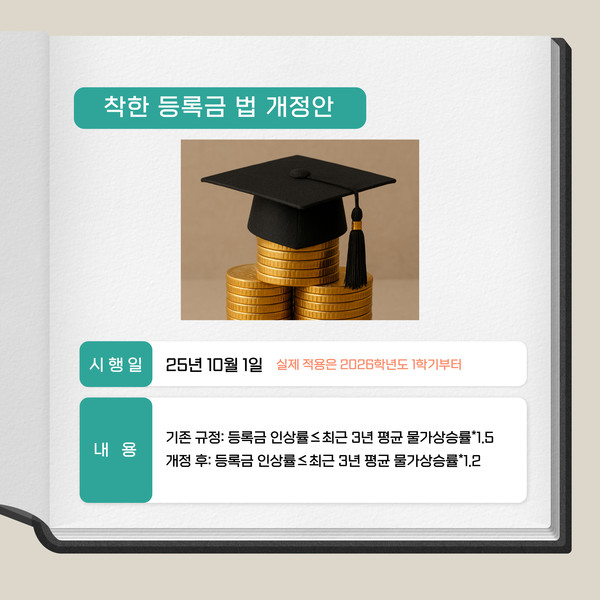 이런 가운데 지난 7월 23일, 국회가 등록금 인상률을 제한하는 ‘착한 등록금 법’ 개정안을 통과시켰어요. 기존에는 소비자 물가 상승률의 1.5배까지 올릴 수 있었는데, 앞으로는 1.2배까지만 인상할 수 있게 됐어요. 이 개정안은 2026학년도 1학기부터 적용될 예정이에요.