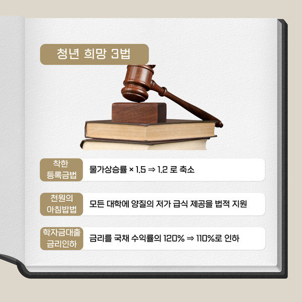 ‘청년 희망 3법’은 청년층의 재정 부담 완화를 목표로 하는 세 가지의 법안을 말해요. ‘청년 희망 3법’을 발의한 정을호 국회의원(더불어민주당, 비례대표)은 “불안한 앞날과 치열한 경쟁, 높은 등록금과 급격한 물가 인상으로 청년들의 마음은 무거워지고, 꿈을 포기하는 상황까지 내몰리고 있다”라며, 청년들을 위한 청년 희망 3법이 모두 통과되어 기쁜 마음을 표했습니다.