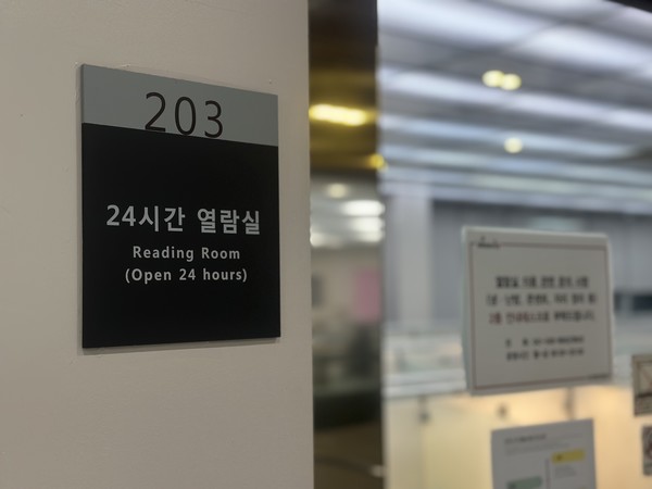 24시간 열람실에는 칸막이가 설치된 독서실 책상이 있어서, 늦은 시간에도 집중해서 공부할 수 있어요.